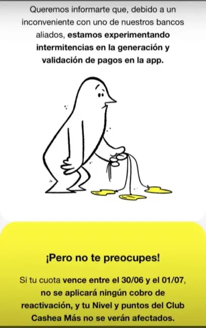 “Debido a un inconveniente con uno de nuestros bancos aliados, estamos experimentando intermitencias en la generación y validación de pagos en la app. Estamos trabajando estrechamente con el Banco Nacional de Crédito para resolver esta situación a la mayor brevedad posible”, se indicó desde Cashea.