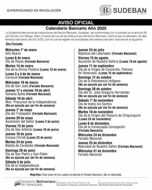 En cuanto al próximo feriado bancario, se encuentra programado para el lunes 13 de enero, con motivo de la celebración de la Divina Pastora, una festividad religiosa de gran relevancia en el país.