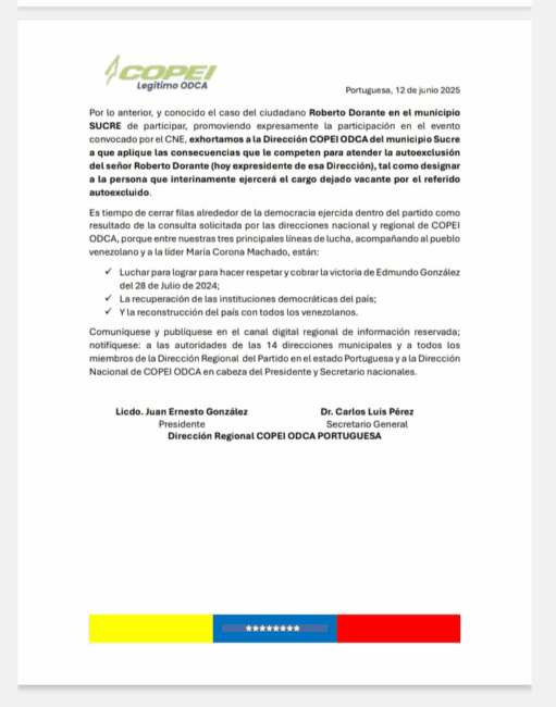 “Es fundamental que la Dirección Municipal de COPEI en Sucre asuma las consecuencias pertinentes ante la participación de Roberto Dorante en la convocatoria del CNE. Esto implica designar un sustituto interino para el cargo que actualmente ocupa Dorante, mientras se lleva a cabo la reestructuración que corresponda, según los estatutos del partido”, puntualizó la Dirección Regional de COPEI ODCA.