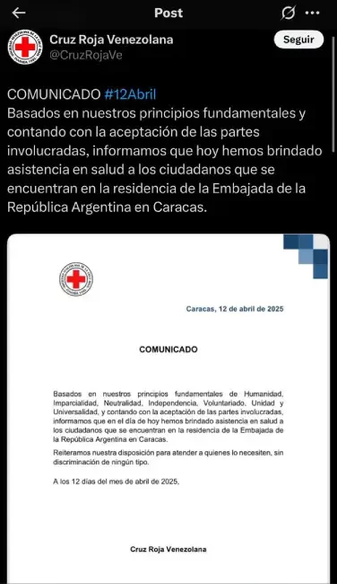 En un comunicado difundido a través de su cuenta de Instagram, Farías detalló que la asistencia se realizó en respuesta a la solicitud de los asilados. “Basados en nuestros principios fundamentales de humanidad, imparcialidad, neutralidad, independencia, voluntariado, unidad y universalidad, informamos que hemos brindado asistencia en salud a los ciudadanos que se encuentran en la residencia de la Embajada de la República Argentina en Caracas”, indicó.