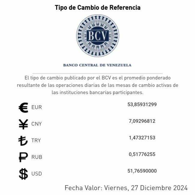 El Banco Central de Venezuela (BCV) ha establecido el valor del dólar en Bs. 51,76 para la jornada de este viernes 27 de diciembre. Este valor se deriva de la cotización del día anterior, jueves 26 de diciembre, cuando el dólar cerró en Bs. 51,76, reflejando un incremento de 0,12 céntimos respecto a la jornada anterior, donde se había ubicado en Bs. 51,64.