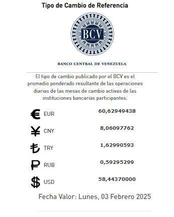 Para el inicio de febrero, el resto de las divisas presentan los siguientes valores: el euro se cotiza a 60,62 bolívares, el yuan chino (CNY) a 8,06 bolívares, la lira turca (TRY) a 1,62 bolívares, y el rublo ruso (RUB) a 0,59 bolívares.
