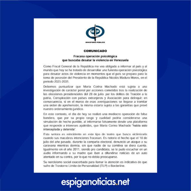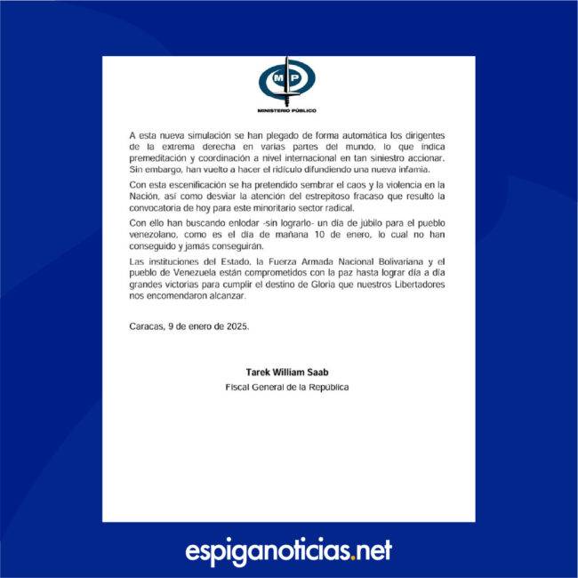 En el pronunciamiento, el Ministerio Público describió la detención como una “funesta operación psicológica para desatar actos de violencia“. Este incidente ha generado diversas reacciones en el ámbito político y social del país, sobre todo por su cercanía con un evento de alta relevancia política como lo es la toma de posesión presidencial.