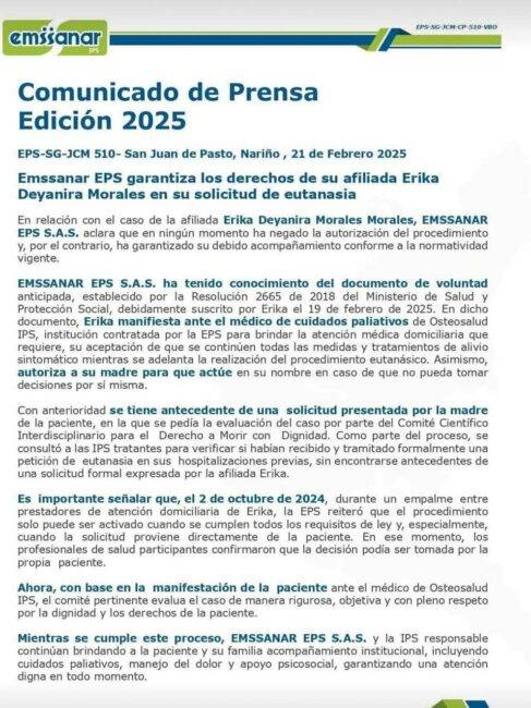 La solicitud de Erika se viralizó rápidamente, generando un debate público sobre el derecho a una muerte digna. Su hermana, Tatiana Morales, compartió un emotivo mensaje en redes sociales, mostrando su apoyo incondicional. Tatiana escribió: “Esto no es fácil, perder a una hermana no es fácil… fue la prueba de amor más grande que le estoy dando a mi hermana”.