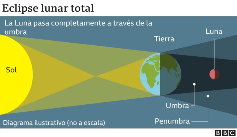 Un eclipse lunar total ocurre cuando el Sol, la Tierra y la Luna se alinean de tal forma que la Luna queda completamente dentro de la sombra proyectada por la Tierra, conocida como “umbra”. A pesar de que la luz solar directa no alcanza la superficie lunar, los rayos atraviesan la atmósfera terrestre, filtrando la luz azul y permitiendo que solo los tonos rojizos lleguen a la Luna, dándole su característico color.