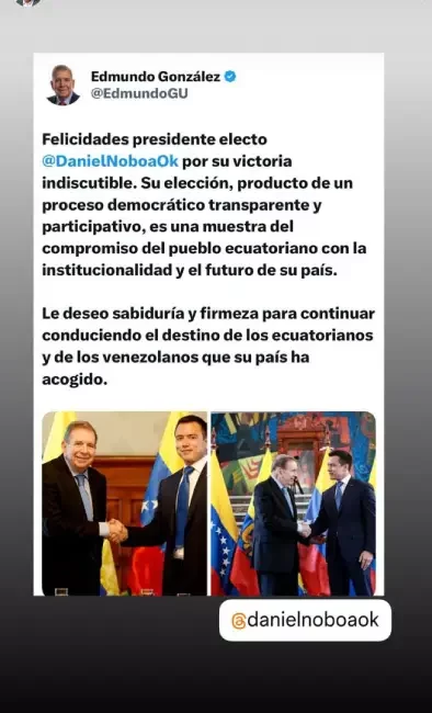 González elogió el proceso electoral ecuatoriano como una demostración del compromiso del pueblo con la institucionalidad y el futuro del país. En su declaración, añadió: «Su elección, producto de un proceso democrático transparente y participativo, es una muestra del compromiso del pueblo ecuatoriano con la institucionalidad y el futuro de su país. Le deseo sabiduría y firmeza para continuar conduciendo el destino de los ecuatorianos y de los venezolanos que su país ha acogido».