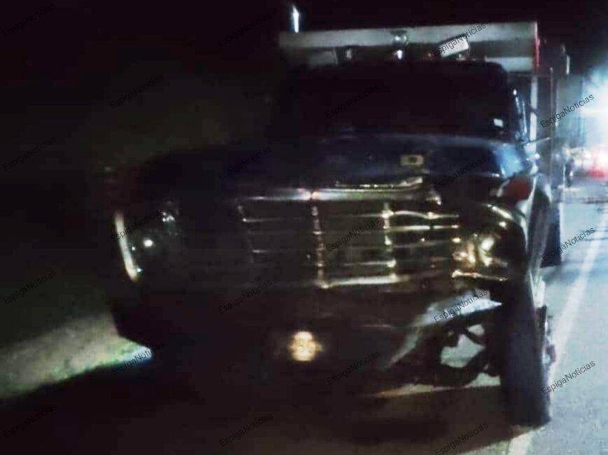 En plena marcha, el infortunado trabajador del campo colisionó de frente contra un camión marca Ford, modelo F-600, tipo estacas, color azul, placas A90BG6A.