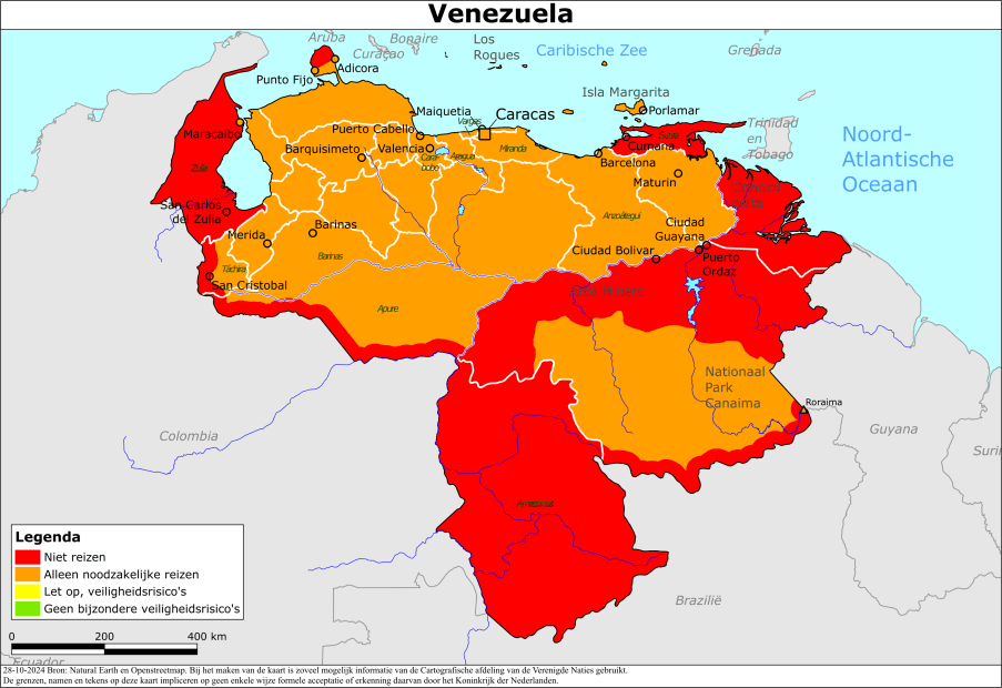 El ministerio ha proporcionado un mapa donde los estados de Venezuela son clasificados por niveles de riesgo. Las áreas señaladas con un código de color rojo son consideradas extremadamente peligrosas y abarcan la mayoría de las zonas fronterizas, así como partes significativas del noroeste, noreste y sur del país. En estas regiones, operan diversas bandas armadas y traficantes de personas, y se reportan tiroteos con regularidad. Además, el comercio ilícito de drogas es prevalente en las fronteras con Colombia y Brasil, así como en el norte de la Península de Paraguaná, donde también ocurren secuestros y robos.