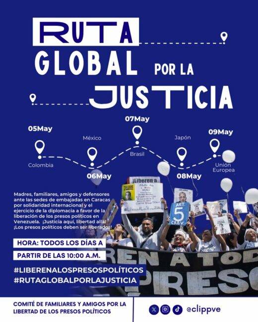 Caracas ha sido testigo de una movilización internacional organizada por el Comité por la Libertad de los Presos Políticos, que bajo el lema “Ruta Global por la Justicia y la Libertad de todos los Presos Políticos”, busca generar conciencia y movilizar apoyo global contra las violaciones sistemáticas de derechos humanos en Venezuela. El evento, que se desarrolla del lunes 5 de mayo al viernes 9 de mayo, congrega a madres, familiares, amigos, defensores de derechos humanos, así como organizaciones sociales y gremiales.