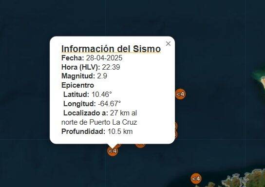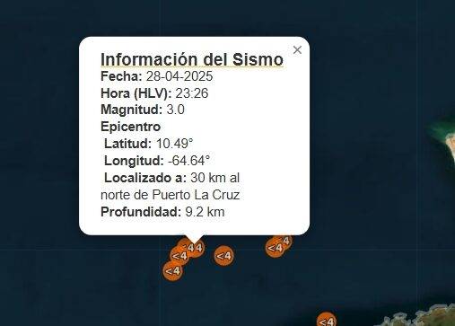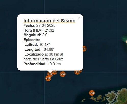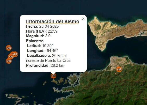 En un corto intervalo de dos horas, la Fundación Venezolana de Investigaciones Sismológicas (Funvisis) reportó la noche del 28 de abril, seis sismos en las cercanías de Puerto La Cruz, localidad del estado Anzoátegui, confirmando así la actividad sísmica en la región. Esta serie de temblores ha generado preocupación entre los habitantes de la zona.