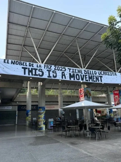 Las pancartas, algunas con mensajes en español e inglés como “El Nobel de la Paz 2025 tiene bello ucagista” y “This is a movement”, combinan creatividad y simbolismo, incluyendo relojes y barras de carga que sugieren un proceso en marcha hacia un cambio democrático. Este movimiento estudiantil parece extender el eco de las actividades del 12 de octubre, fecha en la que Venezuela recuerda la lucha de los pueblos originarios contra la dominación colonial, y podría interpretarse como una apropiación simbólica para abogar por la libertad política actual.