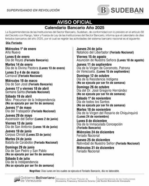 El siguiente feriado bancario en Venezuela está programado para el 17 y 18 de abril, en conmemoración de la Semana Santa. Durante estas fechas, las instituciones financieras adoptarán medidas similares, garantizando que los servicios digitales permanezcan activos para la conveniencia de los usuarios.