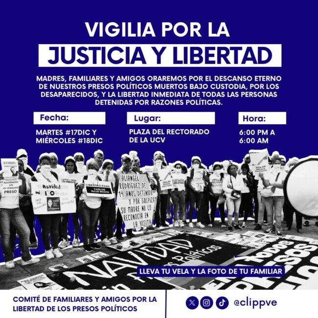 Una vigilia conmovedora se llevará a cabo en la Plaza del Rectorado de la Universidad Central de Venezuela (UCV), donde madres y familiares de presos políticos unirán sus voces en una oración colectiva por la libertad y el cese de la represión. El evento comenzará el martes 17 de diciembre a las 6 p.m. y se extenderá hasta las 6 a.m. del día siguiente. Durante estas 12 horas de reflexión y súplica, los participantes clamarán por el descanso eterno de aquellos que han muerto bajo custodia, así como por la liberación de los que aún están detenidos por razones políticas.